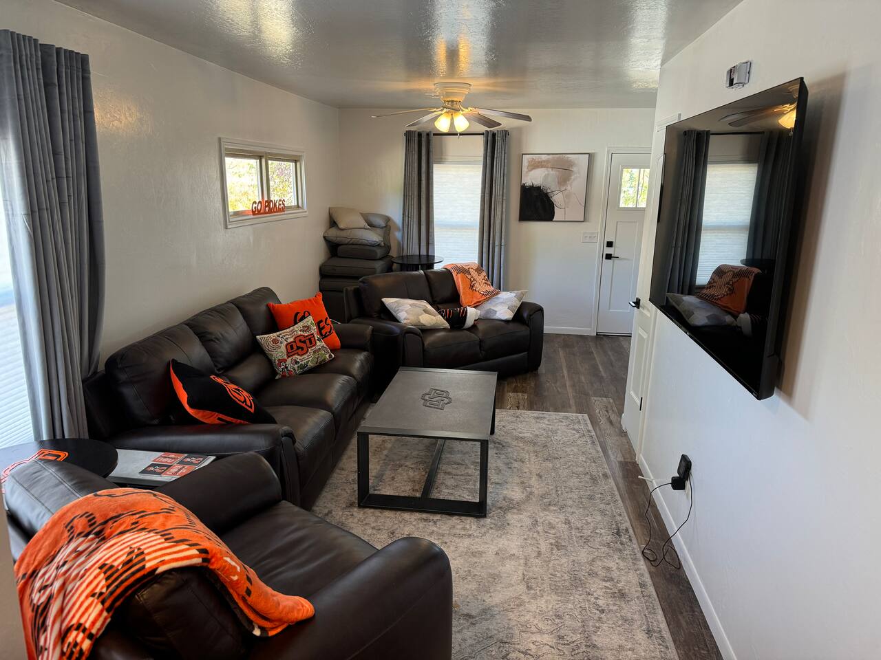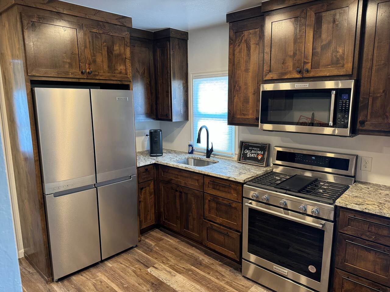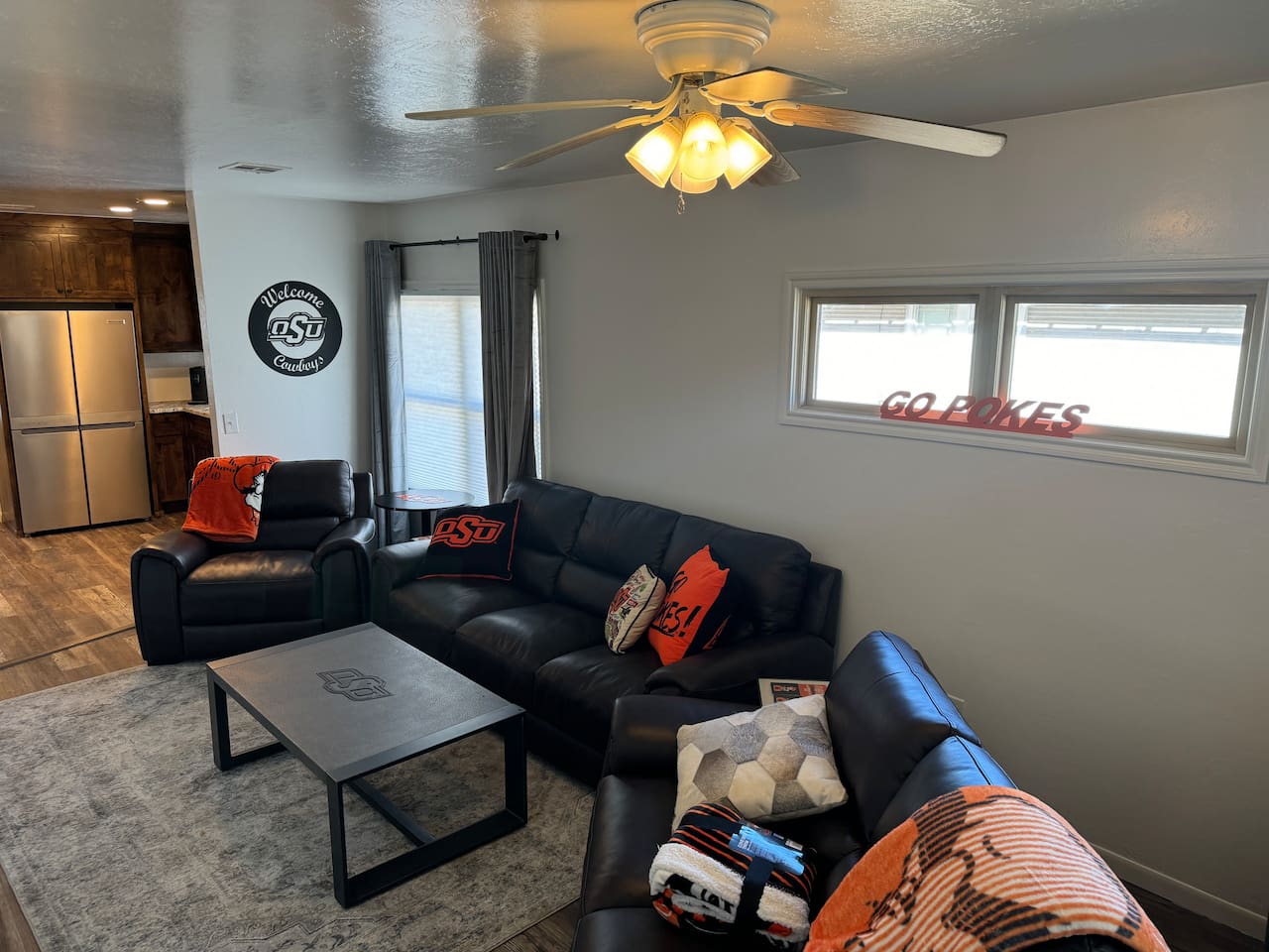 Welcome to your cozy, conveniently located getaway in Stillwater, OK! Situated just steps from Oklahoma State University, this recently renovated home offers an unbeatable location for anyone attending university events or visiting loved ones on campus. **Prime Location & Thoughtful Design:** This charming, intimate space is crafted for comfort and ease. It’s an ideal base for college events like football and basketball games, graduations, and parents' weekends, making it effortless to attend every OSU event just a short walk away. **Comfortable Living Spaces:** Relax in the inviting living room, with a leather couch, loveseat, and chair facing a 75-inch flat-screen TV—great for unwinding after a day on campus. The two king bedrooms provide restful retreats, each equipped with side tables, ample closet space, and wall-mounted 65-inch TVs. **Well-Appointed Kitchen and Bathroom:** The kitchen features new cabinets, granite countertops, and stainless steel KitchenAid appliances, perfect for quick bites or family meals. The bathroom, updated with stylish tile, offers a double sink and a large shower, ensuring a comfortable stay. **Outdoor Space to Unwind:** Enjoy Stillwater’s charm from the covered front porch, complete with cushioned seating—a quiet spot to start your day or unwind. Whether visiting for a university event or to explore the Stillwater area, this home’s exceptional location and cozy, well-designed spaces make it a welcoming retreat. Book now to enjoy a stay just steps from OSU!