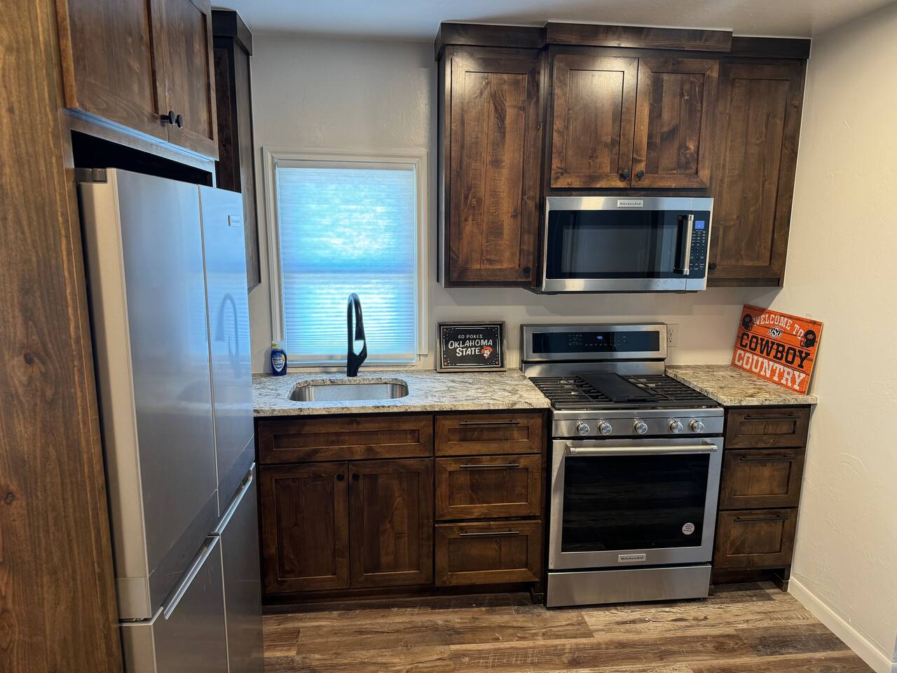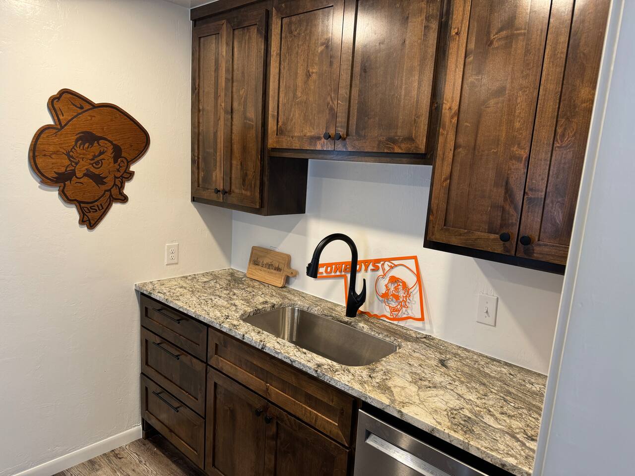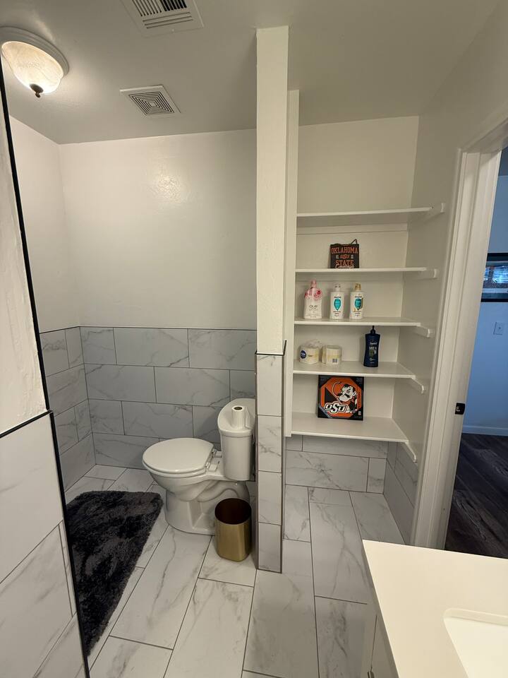 Welcome to your cozy, conveniently located getaway in Stillwater, OK! Situated just steps from Oklahoma State University, this recently renovated home offers an unbeatable location for anyone attending university events or visiting loved ones on campus. **Prime Location & Thoughtful Design:** This charming, intimate space is crafted for comfort and ease. It’s an ideal base for college events like football and basketball games, graduations, and parents' weekends, making it effortless to attend every OSU event just a short walk away. **Comfortable Living Spaces:** Relax in the inviting living room, with a leather couch, loveseat, and chair facing a 75-inch flat-screen TV—great for unwinding after a day on campus. The two king bedrooms provide restful retreats, each equipped with side tables, ample closet space, and wall-mounted 65-inch TVs. **Well-Appointed Kitchen and Bathroom:** The kitchen features new cabinets, granite countertops, and stainless steel KitchenAid appliances, perfect for quick bites or family meals. The bathroom, updated with stylish tile, offers a double sink and a large shower, ensuring a comfortable stay. **Outdoor Space to Unwind:** Enjoy Stillwater’s charm from the covered front porch, complete with cushioned seating—a quiet spot to start your day or unwind. Whether visiting for a university event or to explore the Stillwater area, this home’s exceptional location and cozy, well-designed spaces make it a welcoming retreat. Book now to enjoy a stay just steps from OSU!